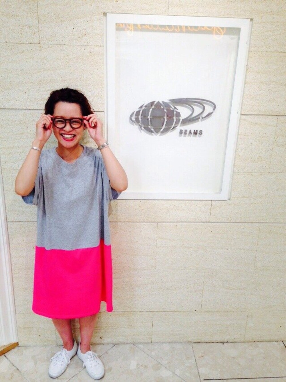 買いたてほやほやのワンピースをメインに! ピンクは初挑戦で、なんか新鮮!って言われました笑 赤系のメガネで統一感を出して、 白スニーカーでさわやかな感じに^^