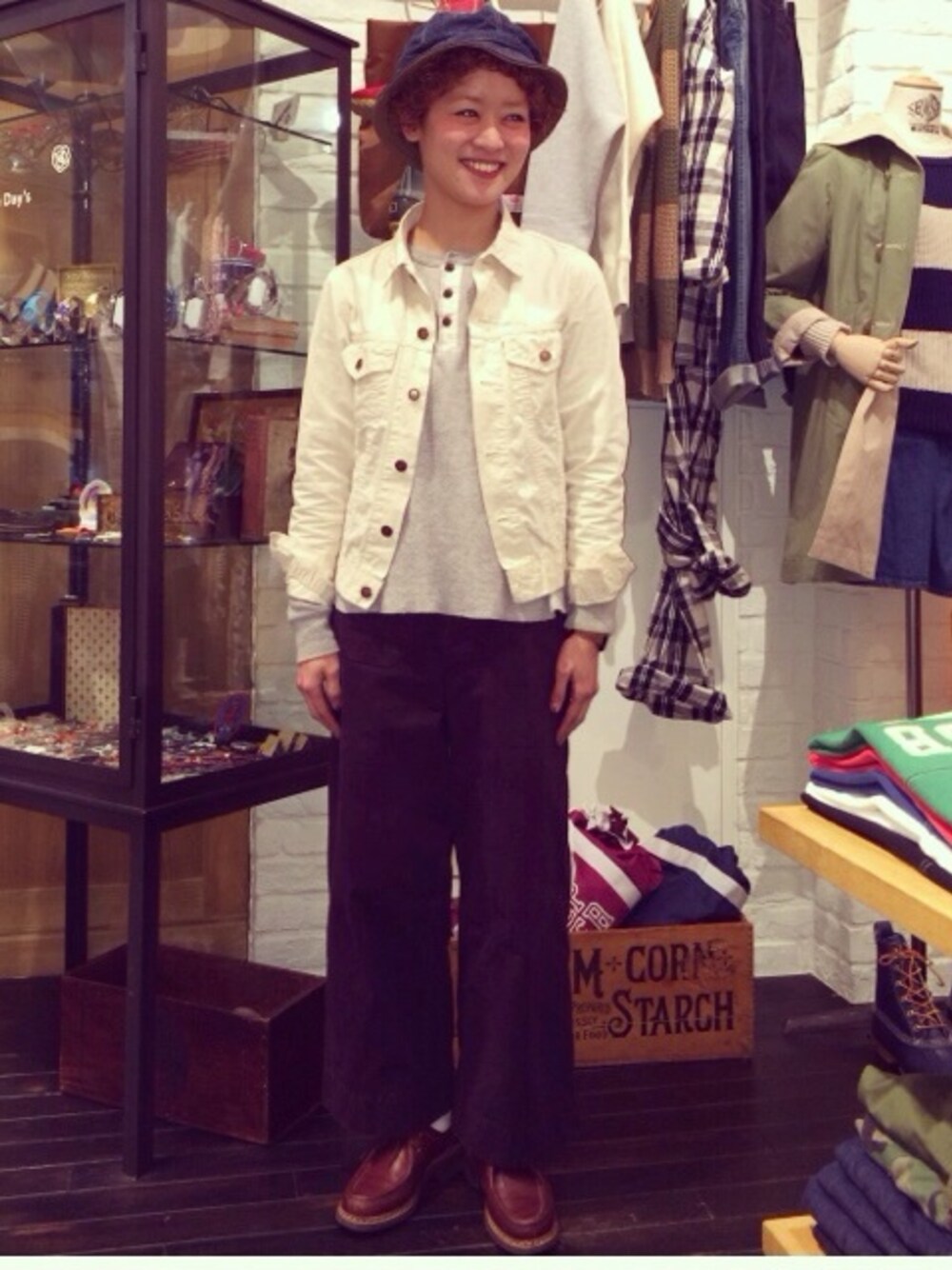 最近購入したお気に入り orslowのホワイトデニムジャケット! ふつうのデニムジャケットよりも薄くて シャツみたいな感覚で着られる! 着丈が短くて野暮くならずに合わせやすいです エシュンがすごい履きやすくなってきた! 黒も欲しい勢い! 今日はお店で撮ってもらった♥︎