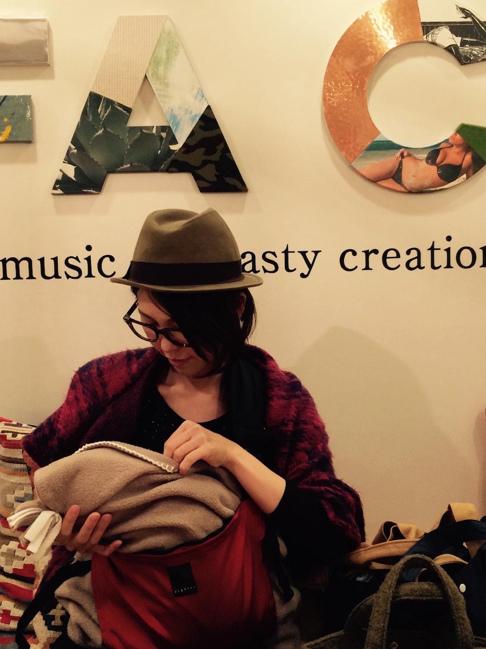子供が産まれたのでマタニティの服から卒業です(o^^o) 相方に借りた、帽子とメガネがポイント♪