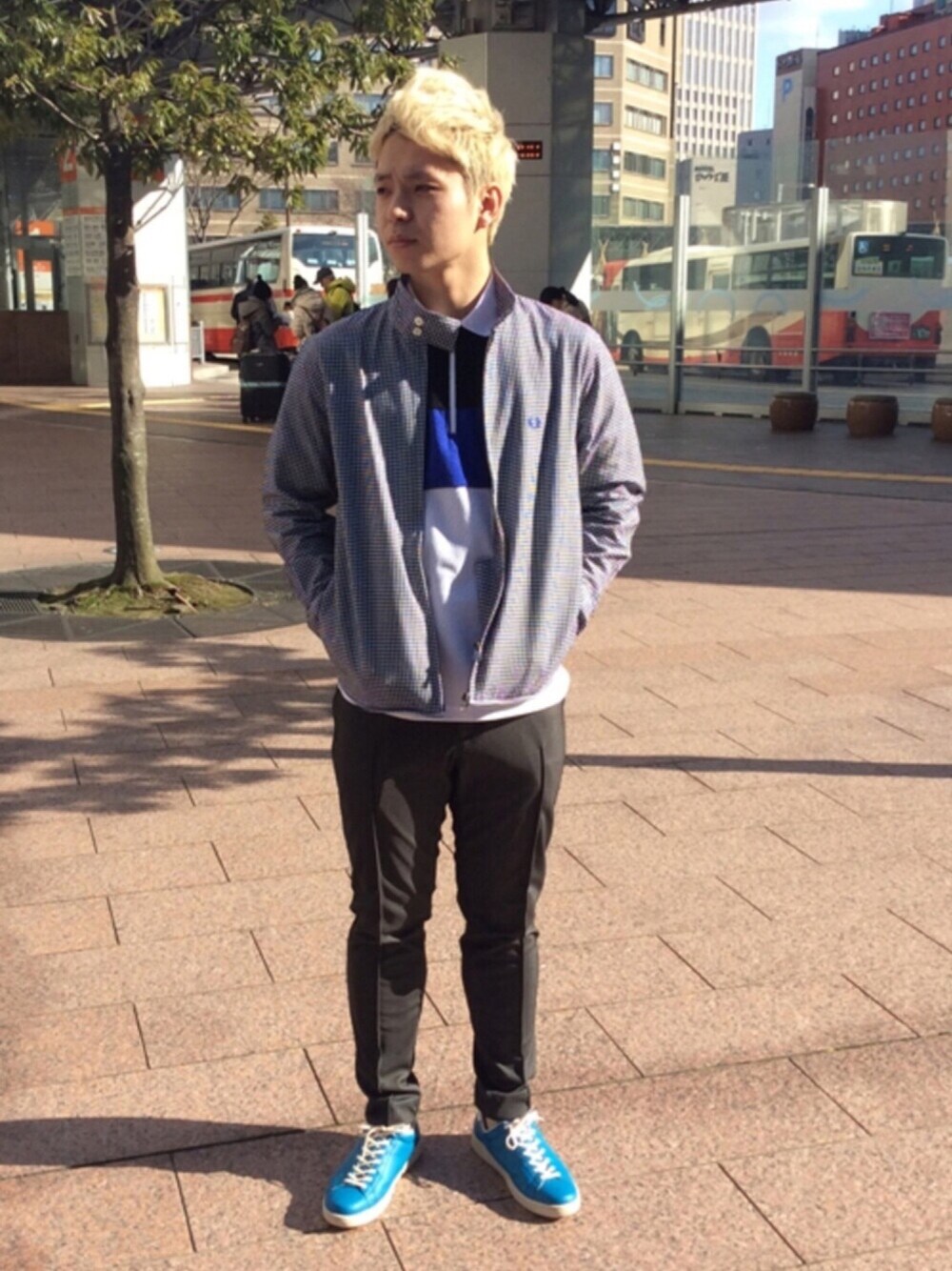こんにちは! 金沢店の山内です! 今回はシャツハリントンをメインにしたコーディネートです^ ^ ポロシャツとシューズはブルーで統一し差し色として明るさを演出してくれます^_^