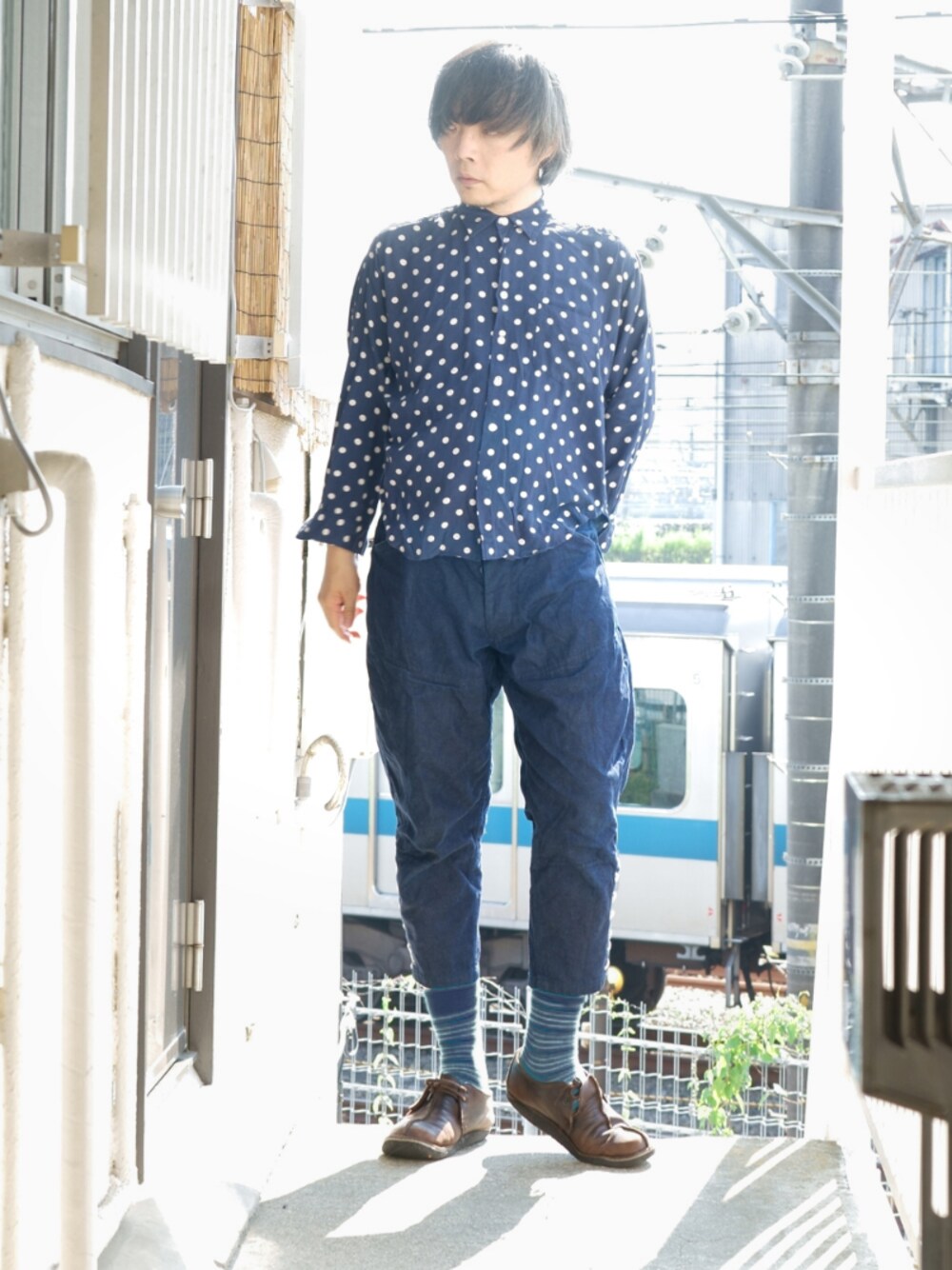 45rの水玉シャツが主役。 インディゴ押しです。