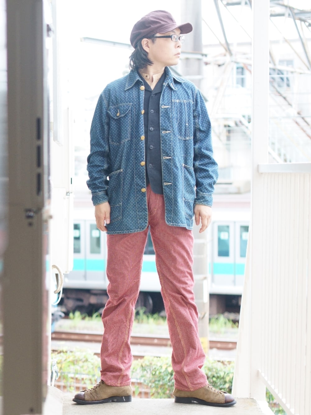 主役はシュガーケーンのカバーオール。 染め抜きのドット柄が気に入ってます。 赤いパンツは間近で見ないと分からないですが織りでストライプになってます。 派手な赤じゃないんです。