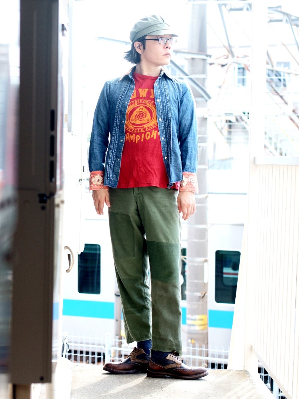パッチワークパンツが主役……のつもりだったんですが赤が強烈ですね。