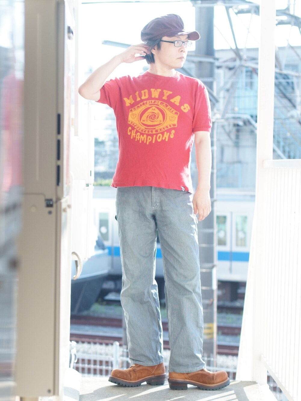 サーマルシャツが主役。 真っ赤。 キャップは45r。 45rのこの形のキャップが気に入ってて、色違いを買い増ししたいくらい。