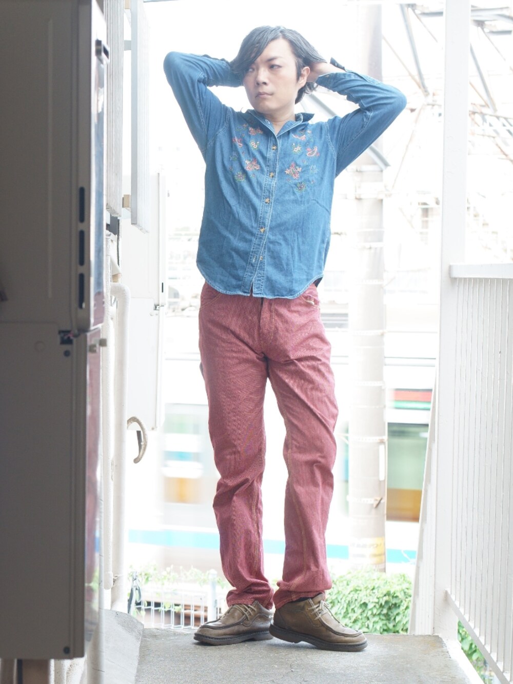 度々、思うんですけど……足が長く見えたり細く見えたり……服の錯覚効果なんでしょうけど不思議。 主役は胸元に大きく刺繍の入ったシャツ。 古いものなだけに物凄く野暮ったい(^_^;)