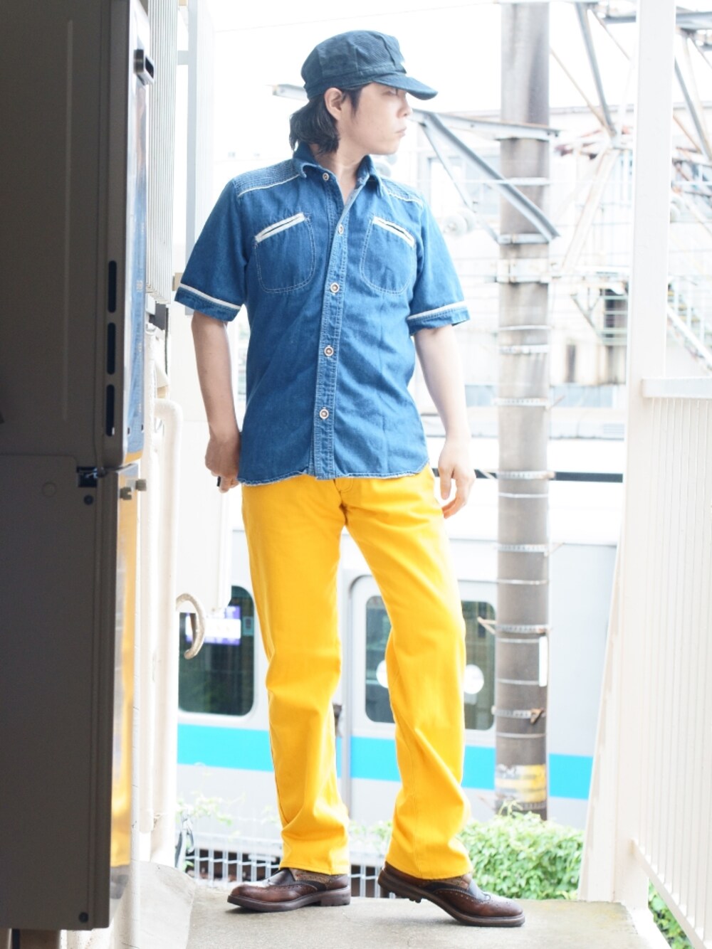 カラーパンツが主役。 青✕黄の組み合わせほ良パターン。