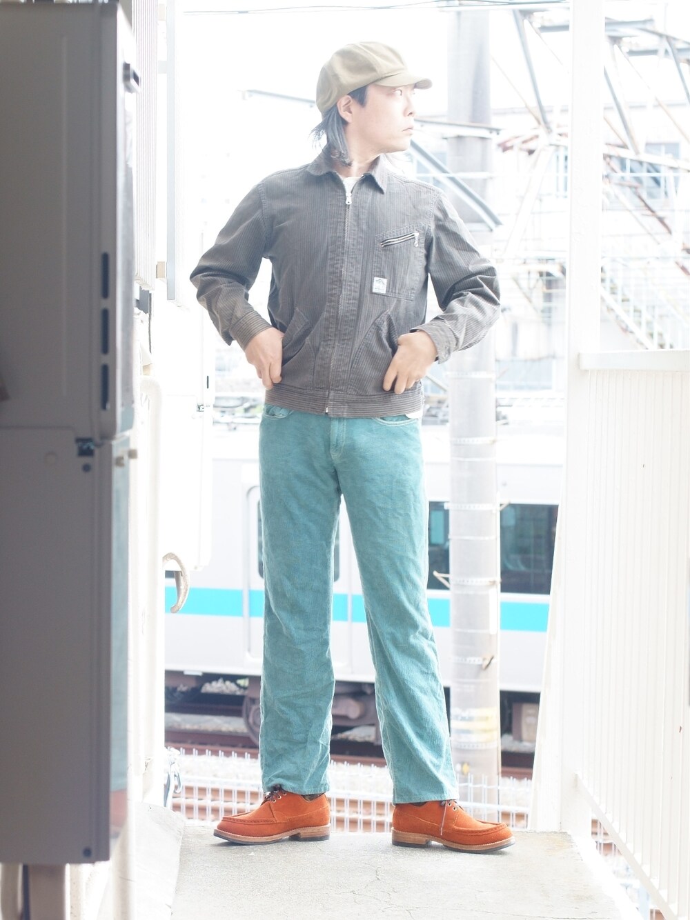 エメラルドグリーンのカラーパンツが主役。 派手な色の筈なんですが……割と普段から普通に履けるエメラルドグリーン。