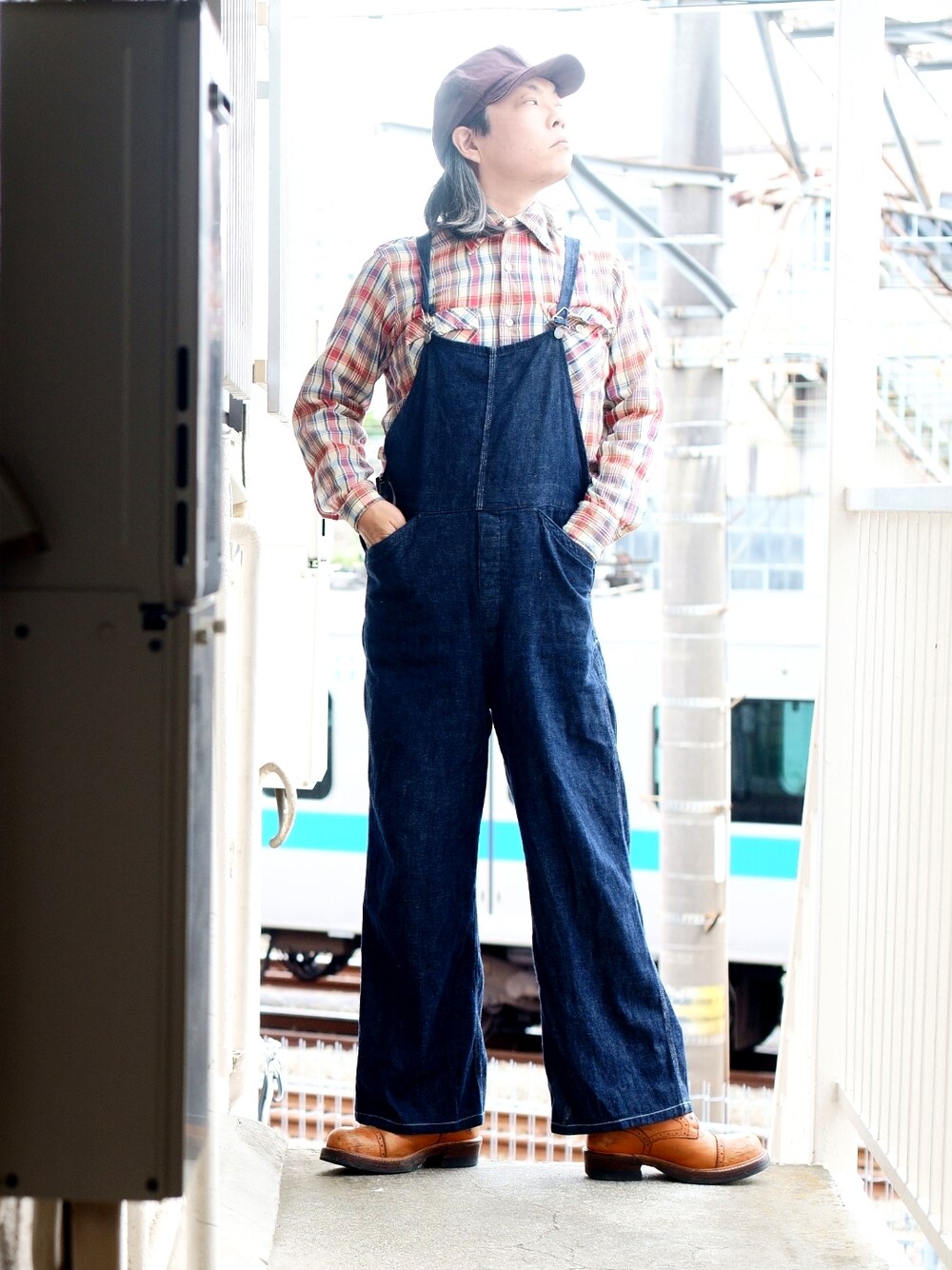 45rのオーバーオールがコーディネートの主役。