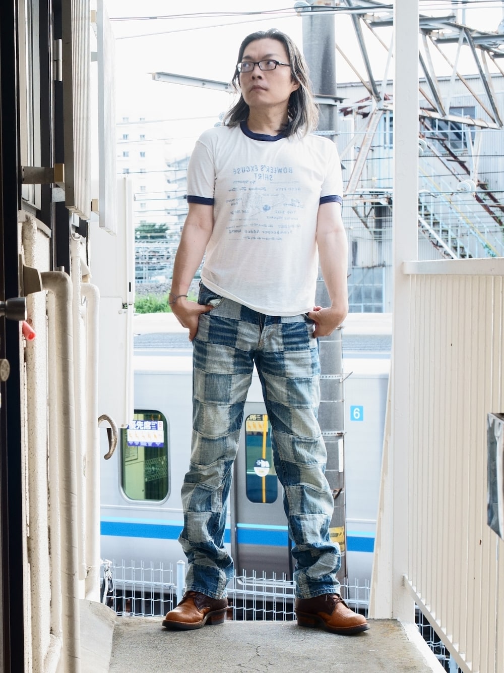 パッチワークパンツがコーディネートの主役。