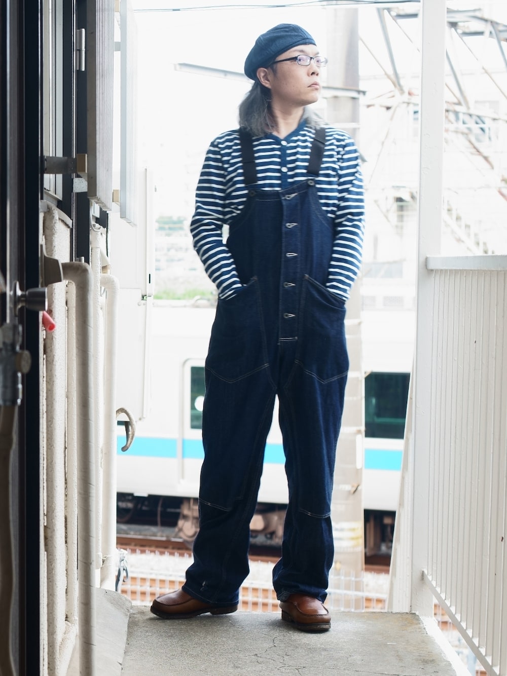 オーバーオールがコーディネートの主役。