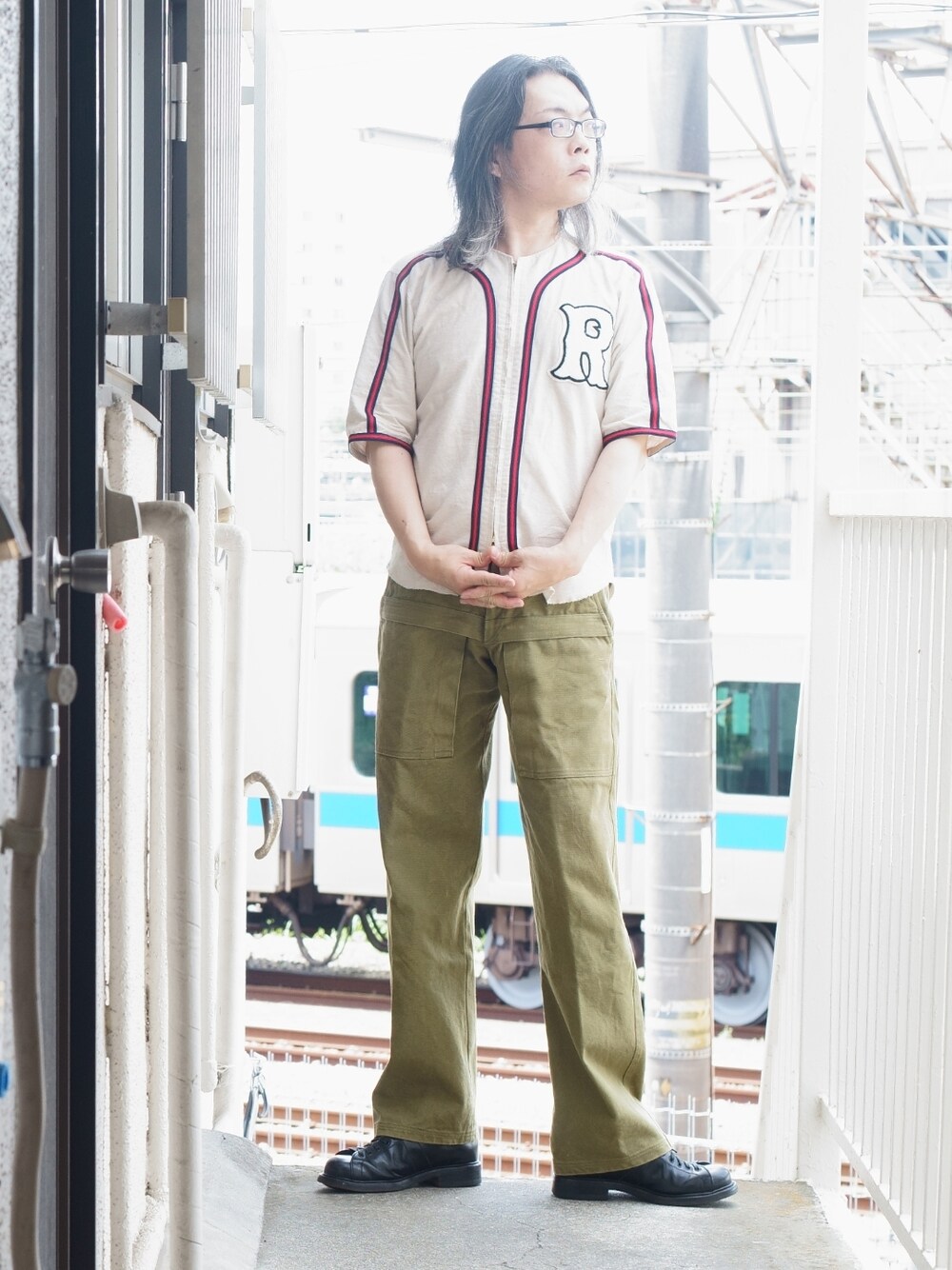 ベースボールシャツがコーディネートの主役。