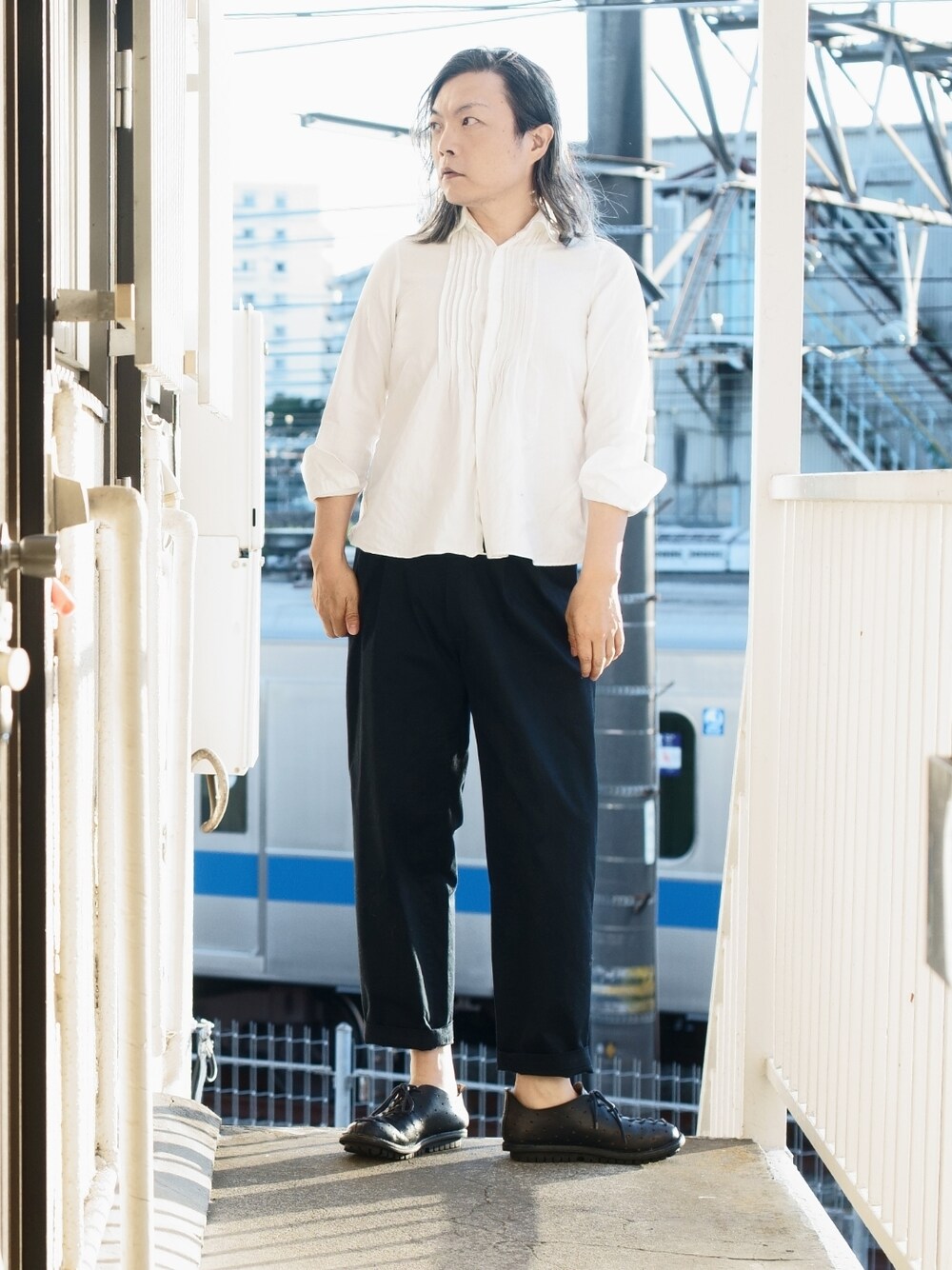 フェローズのアンクル丈黒パンツがコーディネートの主役。