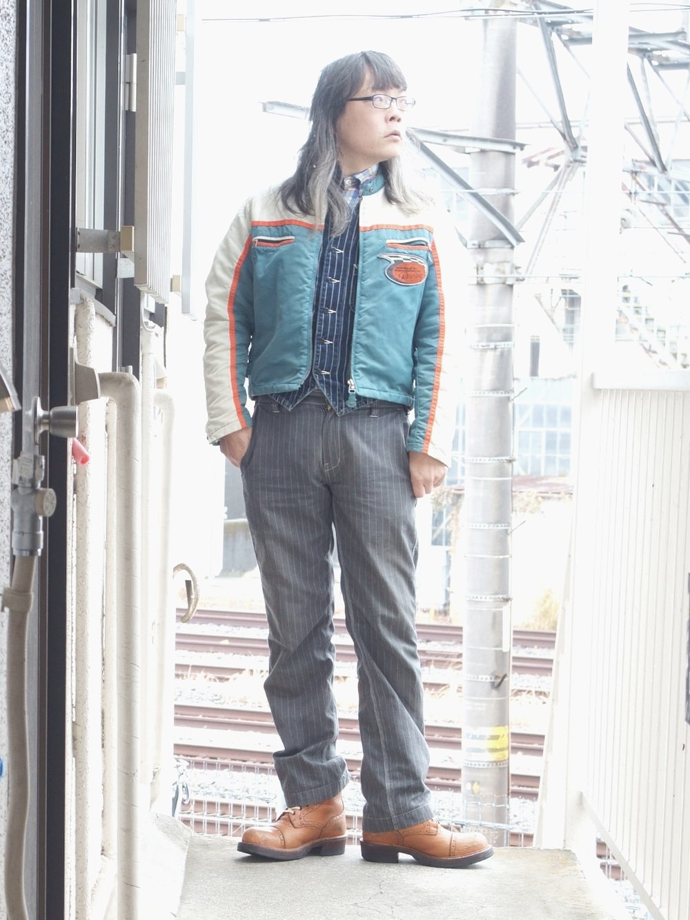 ハーレーダビッドソンのライダースジャケットがコーディネートの主役。 30年くらい前にテレビの通販番組で買ったジャケット。