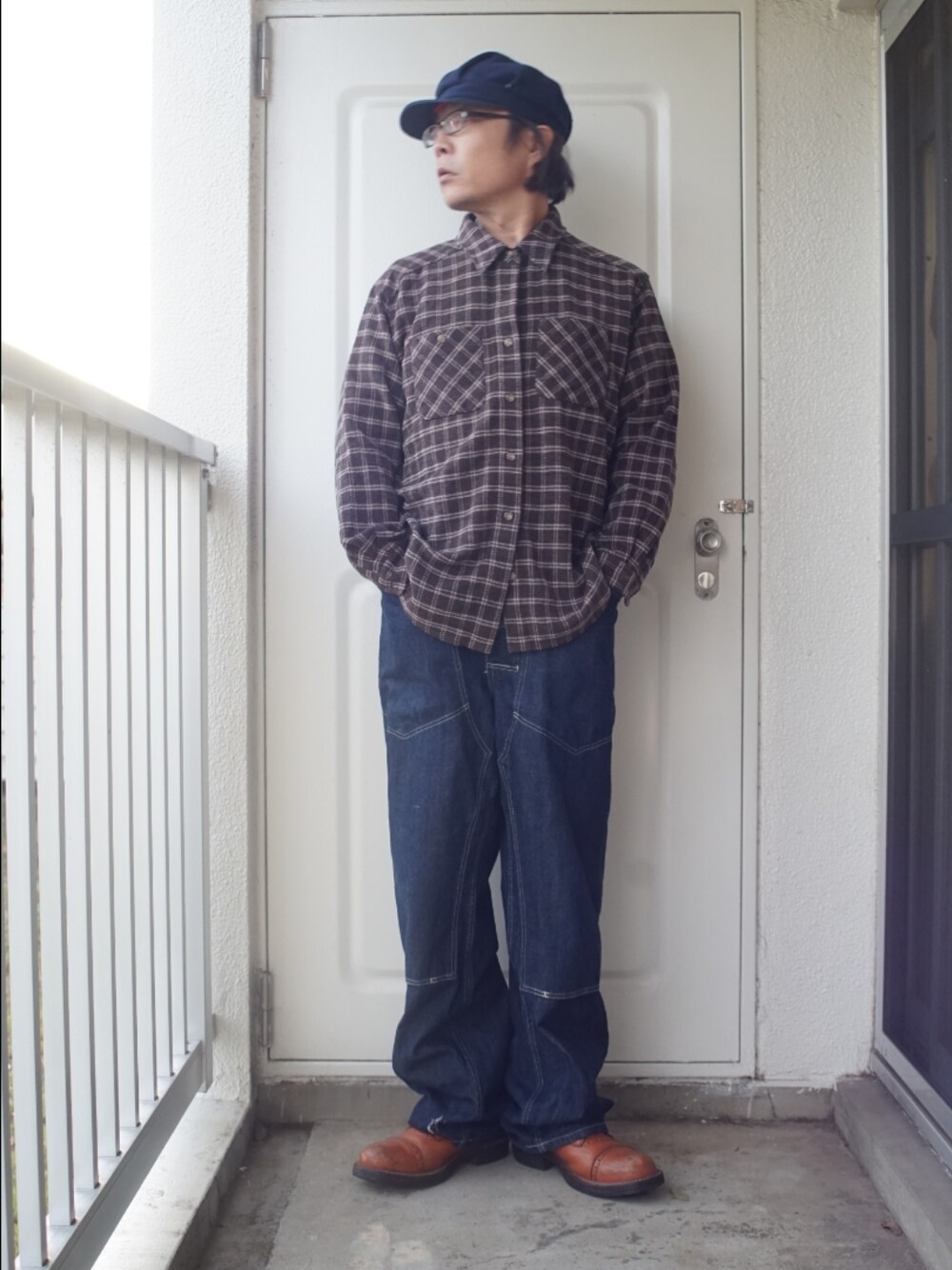 チェックシャツがコーディネートの主役。