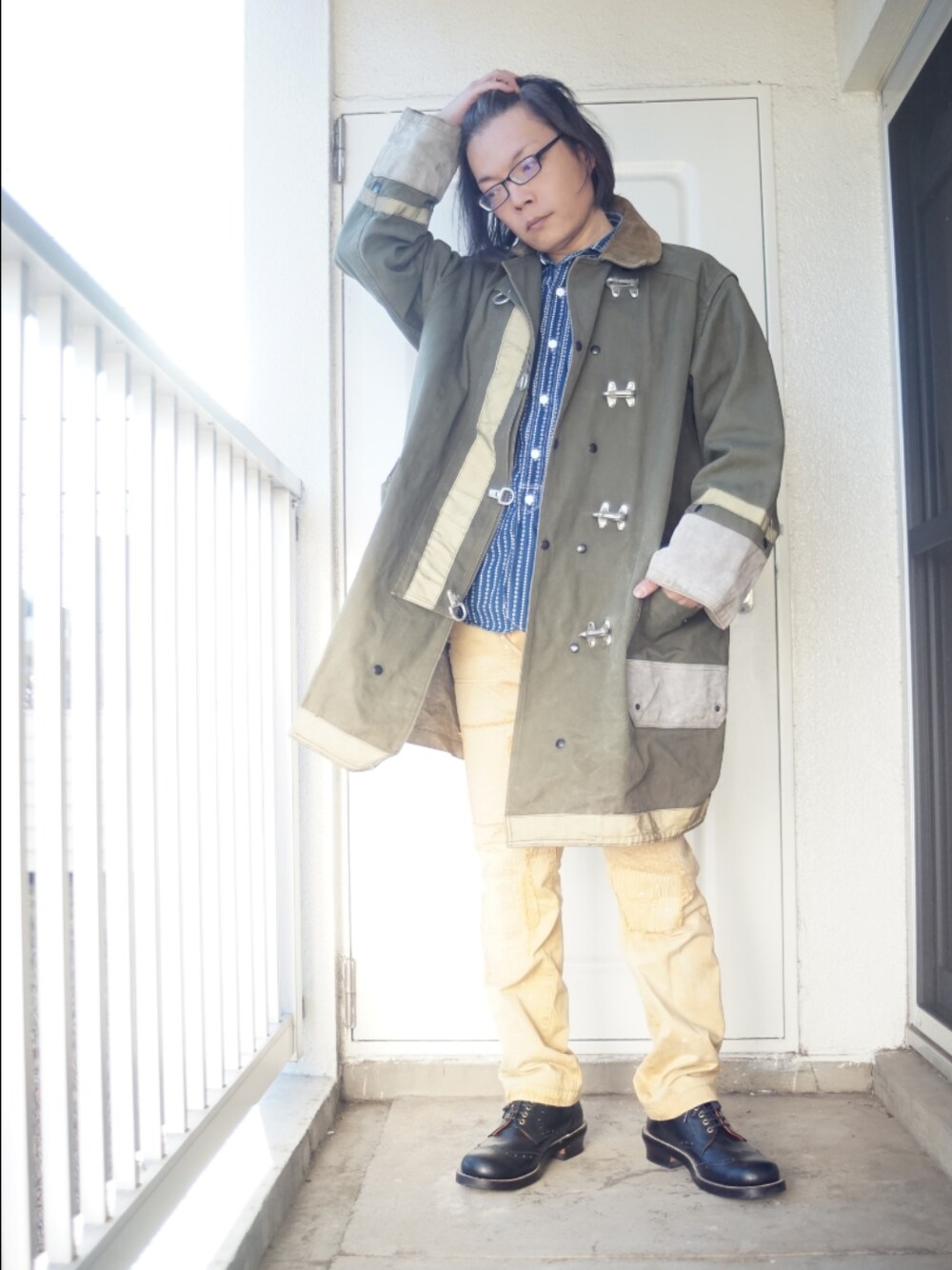 アメリカ軍のファイヤーマンコートがコーディネートの主役。 軍内の消防隊が使用してたものらしいです。 風雨を通さない堅牢な作りが気に入っますが……めちゃくちゃ重いのが難。
