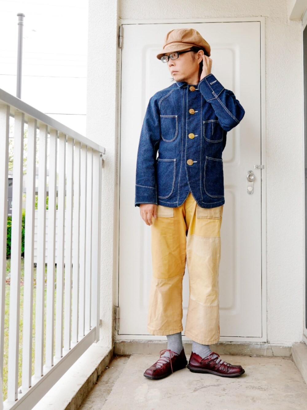 Aozoraの刺し子カバーオールがコーディネートの主役。