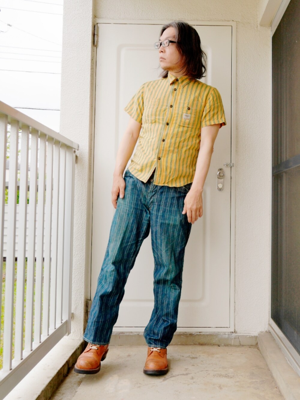 ストライプ柄のシャツがコーディネートの主役。