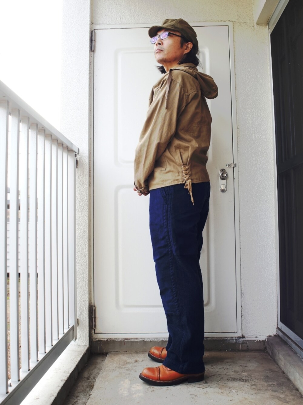 ミュラー&ブロスのパーカージャケットがコーディネートの主役。 ヴィンテージアイテム好きのデザイナーの拘りが詰め込まれたデザインが気に入ってます。