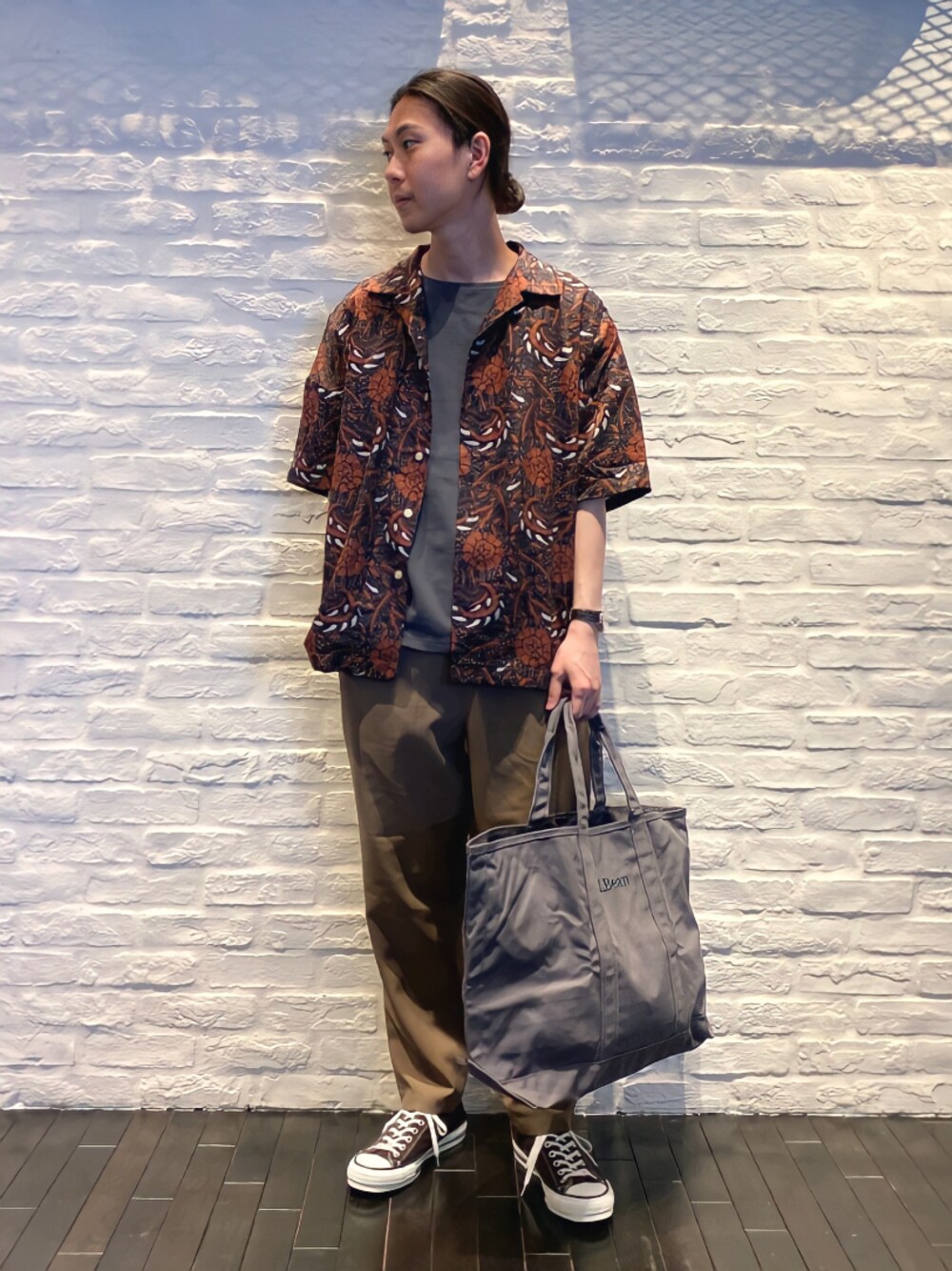 柄シャツを使ってエキゾチックにまとめました。 色味は暗いですが柄シャツのおかげで夏らしく仕上がってます。