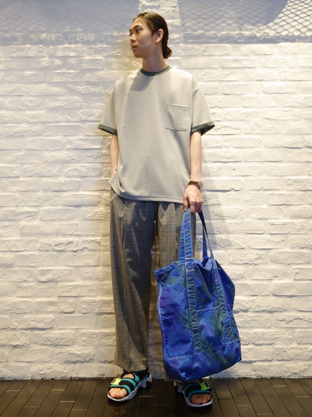 夏らしいパステルミントのTシャツを合わせました。 首周りや袖口が裏地を折り返してバイカラーになってるのがかわいいです! ナイキのサンダルのカラーリングから全体の色合い考えました。