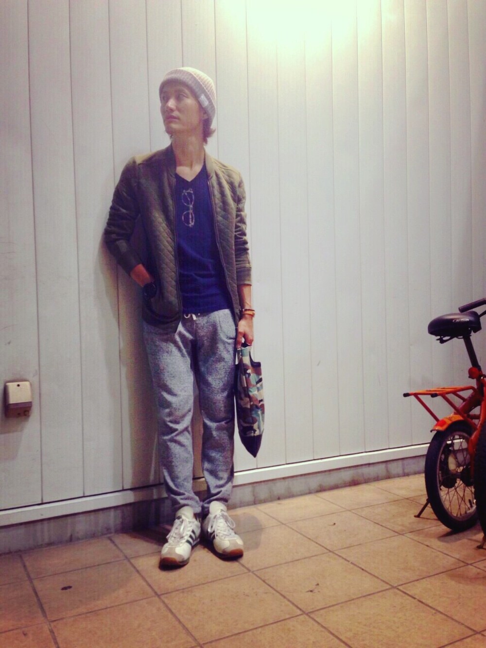 今日はグリーン&グレー祭りになってしまった(笑) ニット帽の色を変えれば良かったかな〜 インナーのネイビーで少しは締まって見えると良いのだが(´Д` )