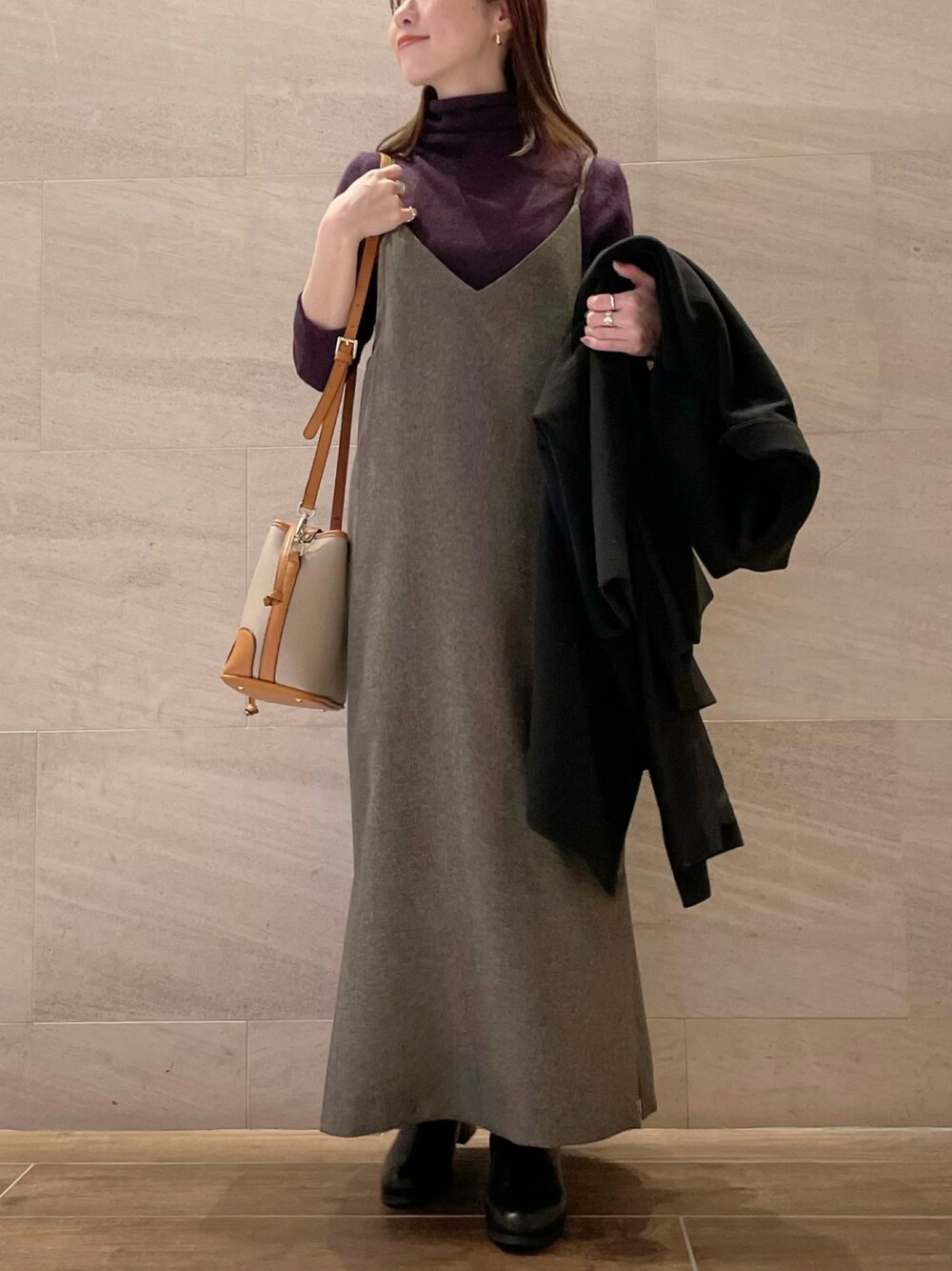 risaのワンピース「ツイードバックタックキャミワンピース」を使ったコーディネート