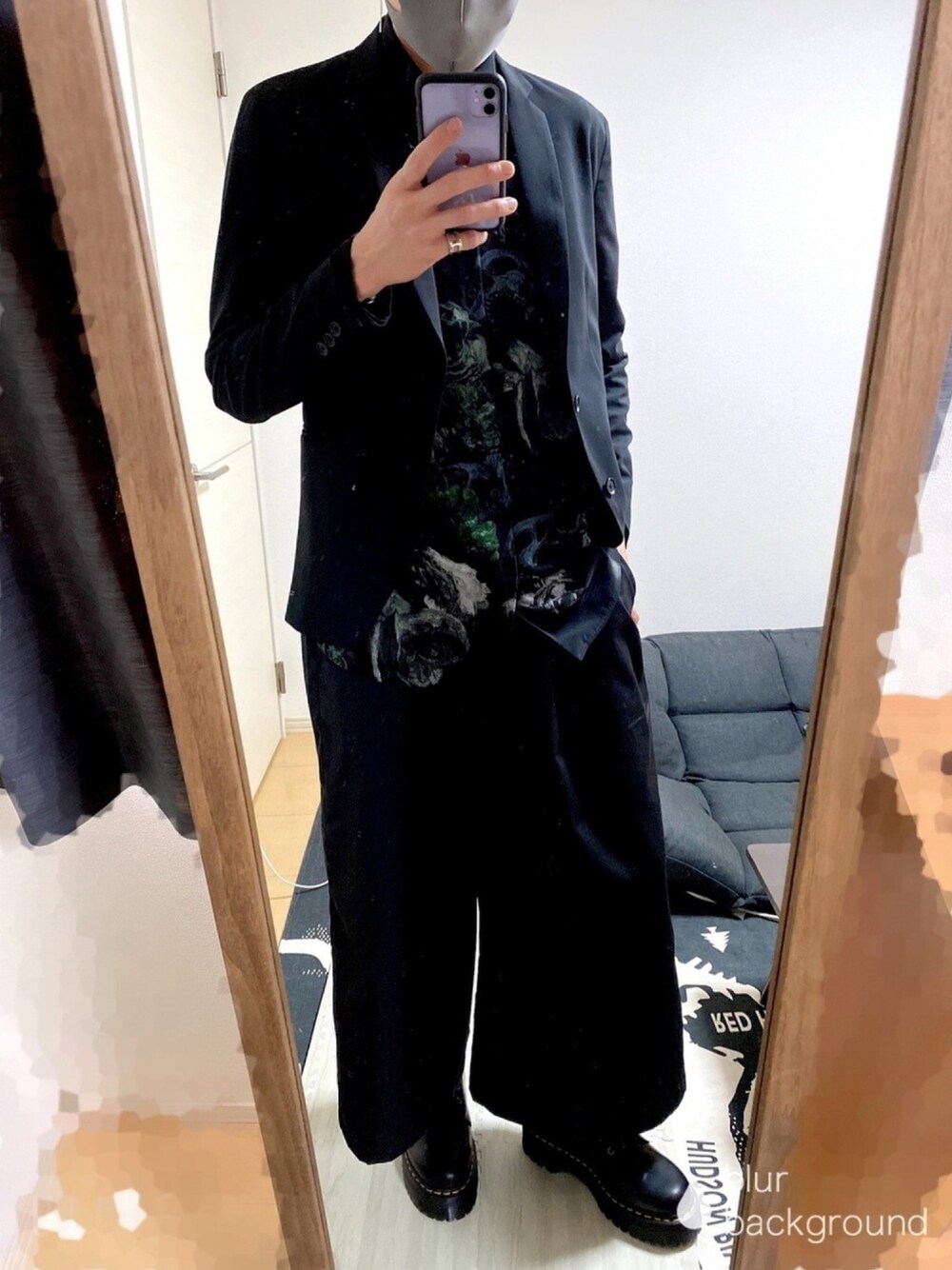 今日はブラックコーデ! 上はピッシリ、下は緩めでAシルエットを意識してみました🧐 ちょっと厨2くさいかも…?w デートではオススメできない🙅🏼♂️ インナーは柄シャツとか柄物のTシャツは どれでも合う気がしますね🙆🏼♂️ 余談ですが、家に無かった姿鏡買いました!!w