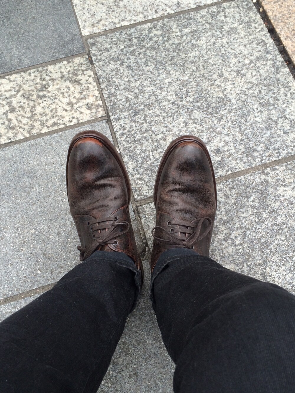ブラウン系のドレスシューズを着用したメンズの春コーディネートの1枚目の写真