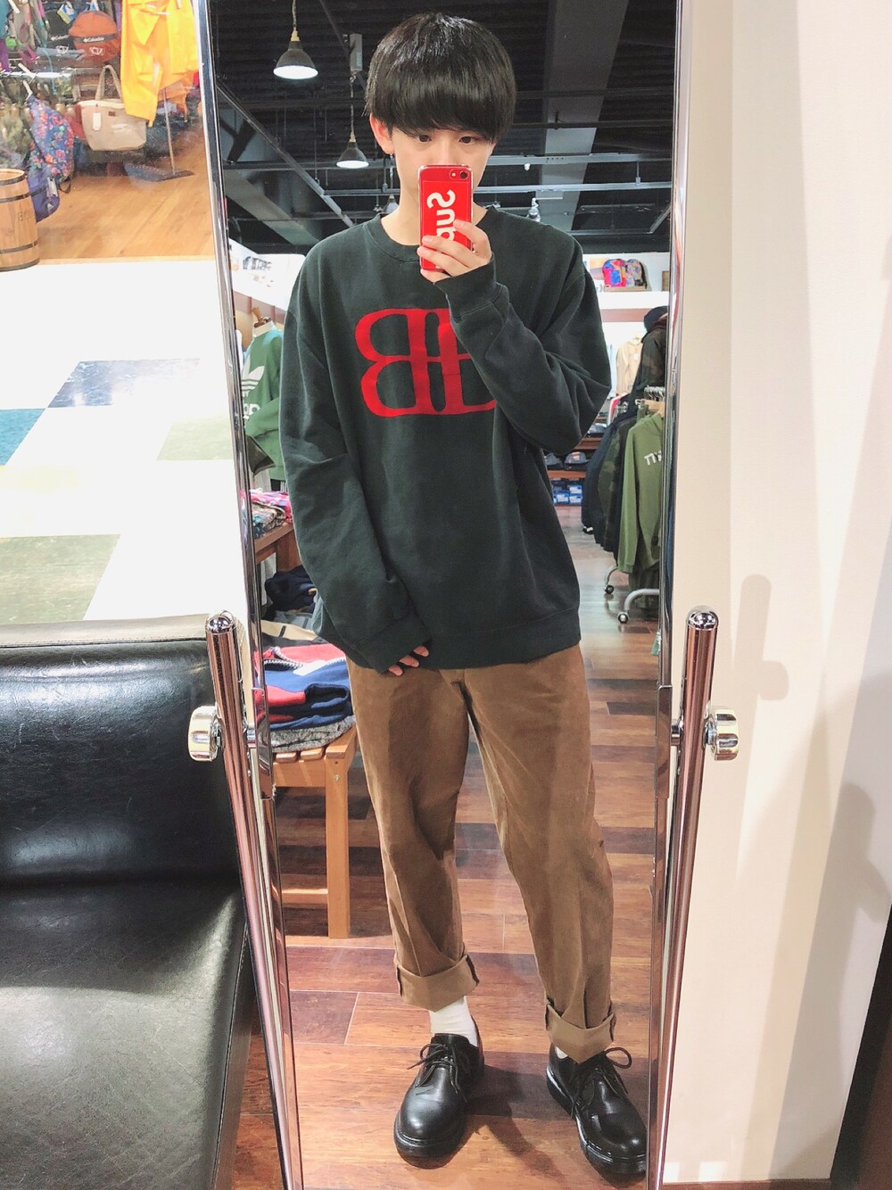 黒スウェット×コーデュロイパンツ ちょっと服の系統変えて秋っぽいコーデしてみました!🍁 古着屋で買ったスウェットお気に入り👍
