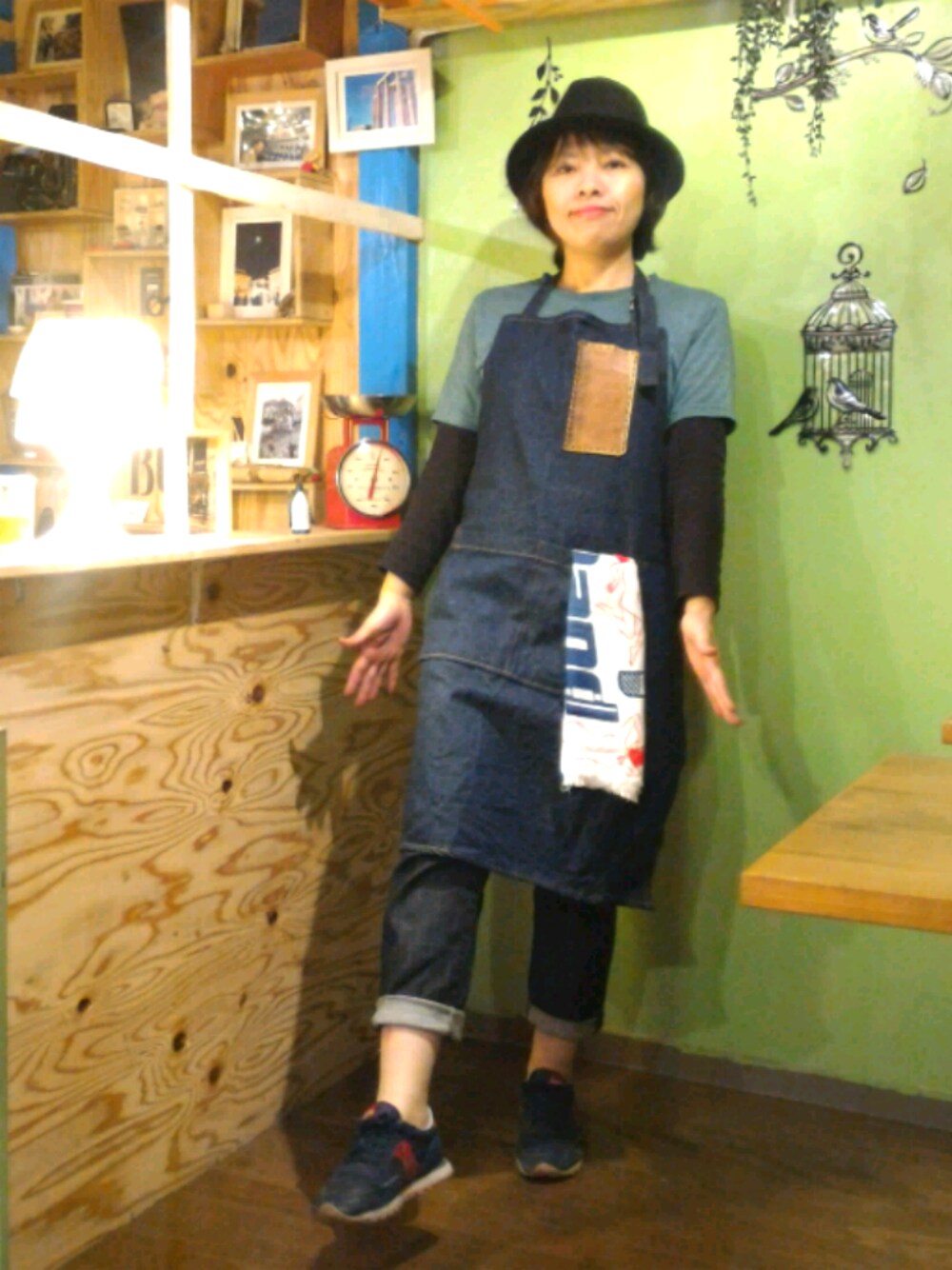 こちらのエプロンはメルカリでお安く購入してレザーポケットを縫いつけてみました~♪