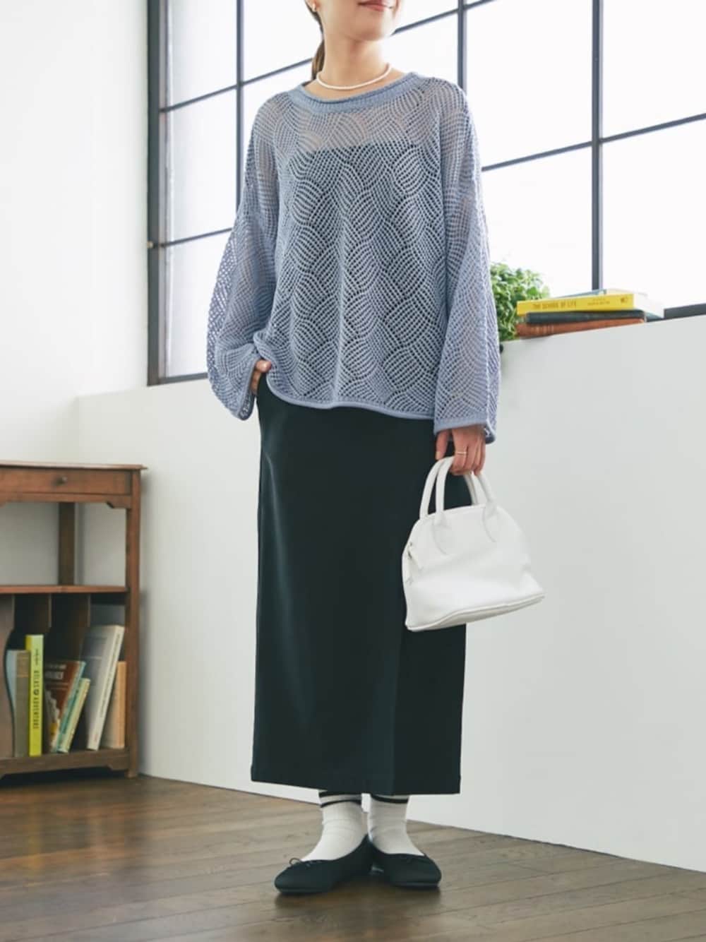 メッシュニット×ナロースカート インしなくてもゆるっとした着こなしが決まるコーデです