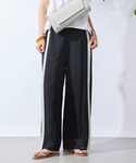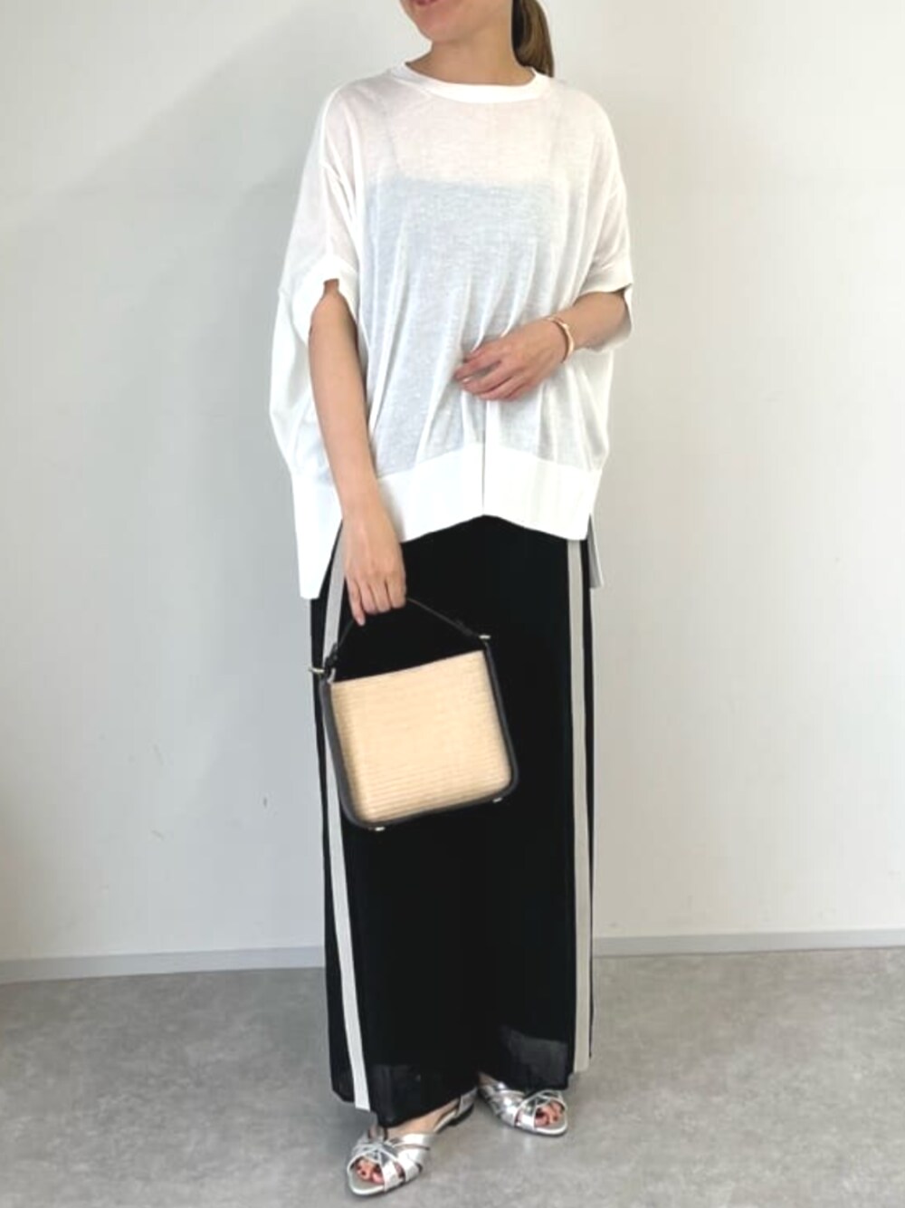 サマーニット×ラインパンツ 薄手のニットは二の腕が隠れるので体型カバーにおすすめ