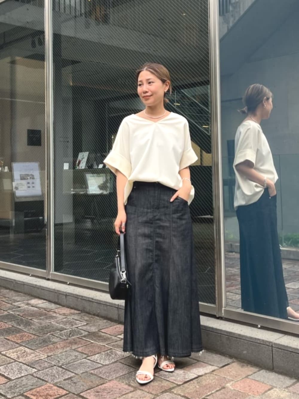 ニュアンススリーブブラウス×デニムスカート リラックスなシルエットで楽ちんキレイめスタイル