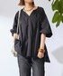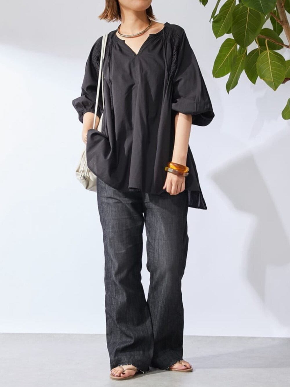 ブラックコーデ ギャザーブラウスとブラックデニムで大人カジュアルなコーデです