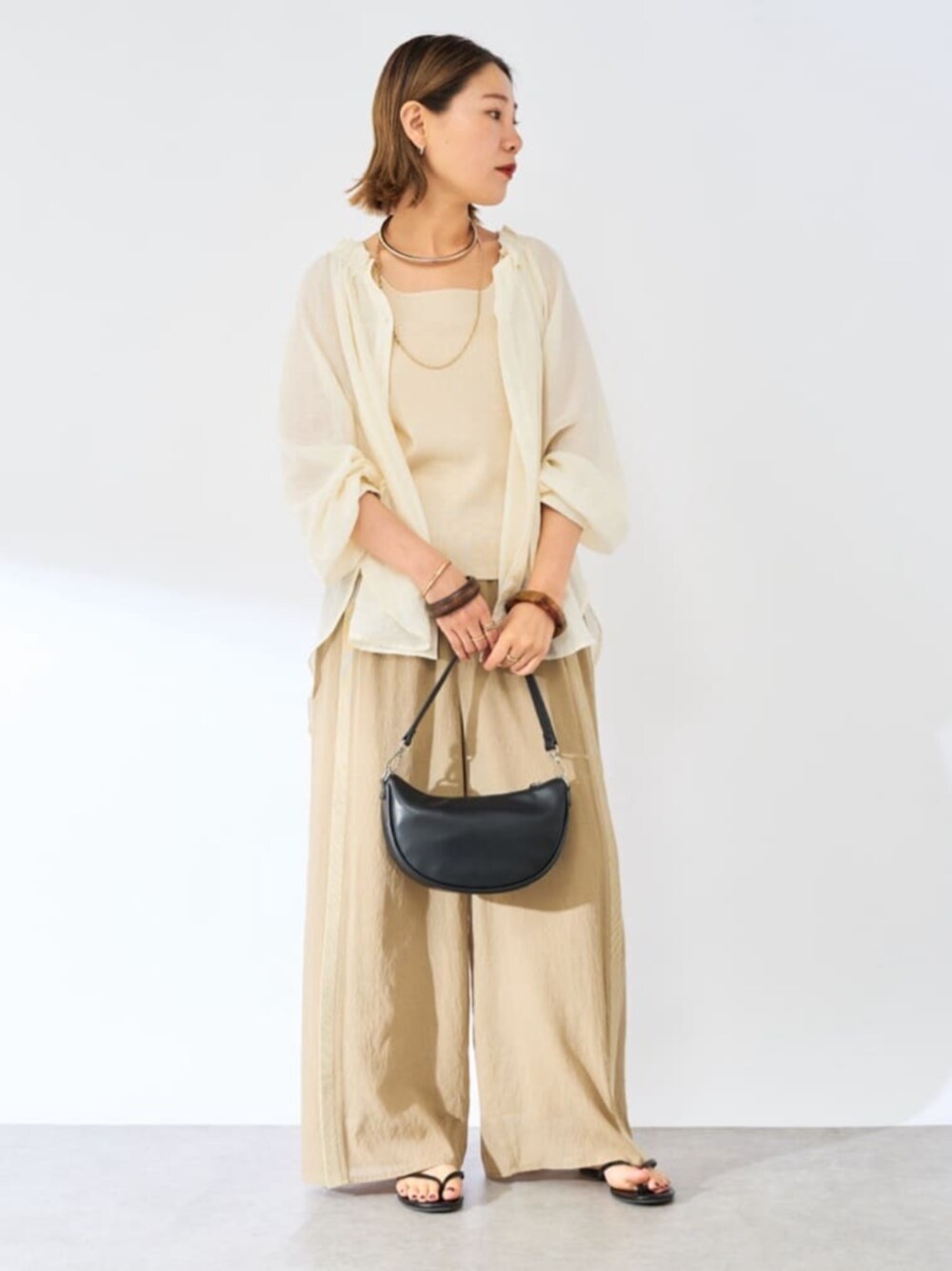 ワントーンコーデ 小物でブラックを入れてメリハリをつけるのがポイント