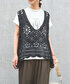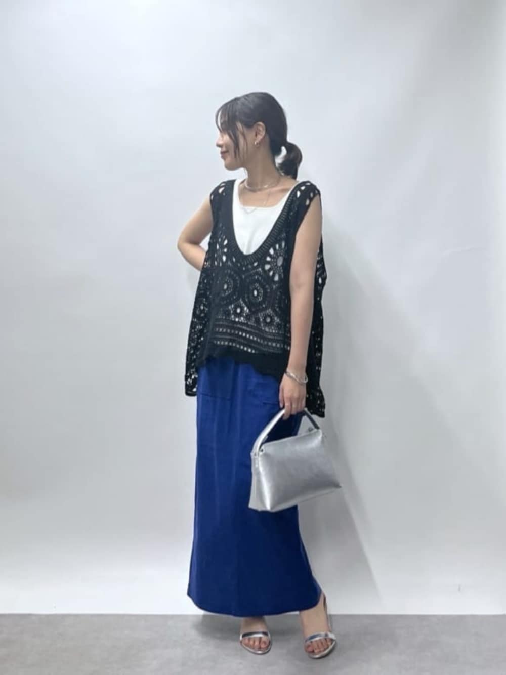 クロシェ編みベストの新色ブラックを使用したコーデ。 ナロースカートの時もヒップが隠れる長さなので安心感があるアイテムです。