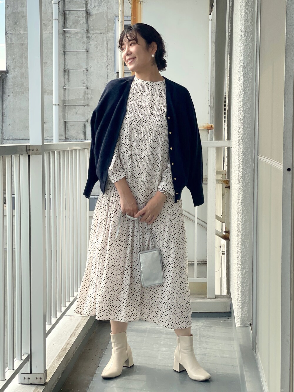 udcemiのワンピース「女性らしい繊細なデザイン ダルメシアンプリントプリーツワンピース」を使ったコーディネート
