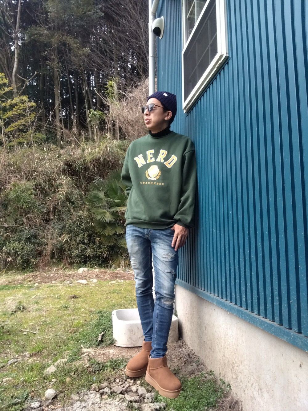 よく食べ寝て音楽聴き旅ほぼデニムのスウェット「裏起毛カレッジロゴクルーネックスウェット」を使ったコーディネート