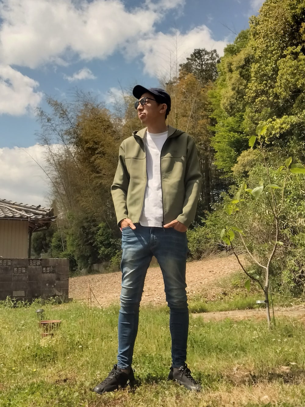 よく食べ寝て音楽聴き旅ほぼデニムのデニムパンツ「ハイパーストレッチサルエルスキニーデニム ジェギンス」を使ったコーディネート
