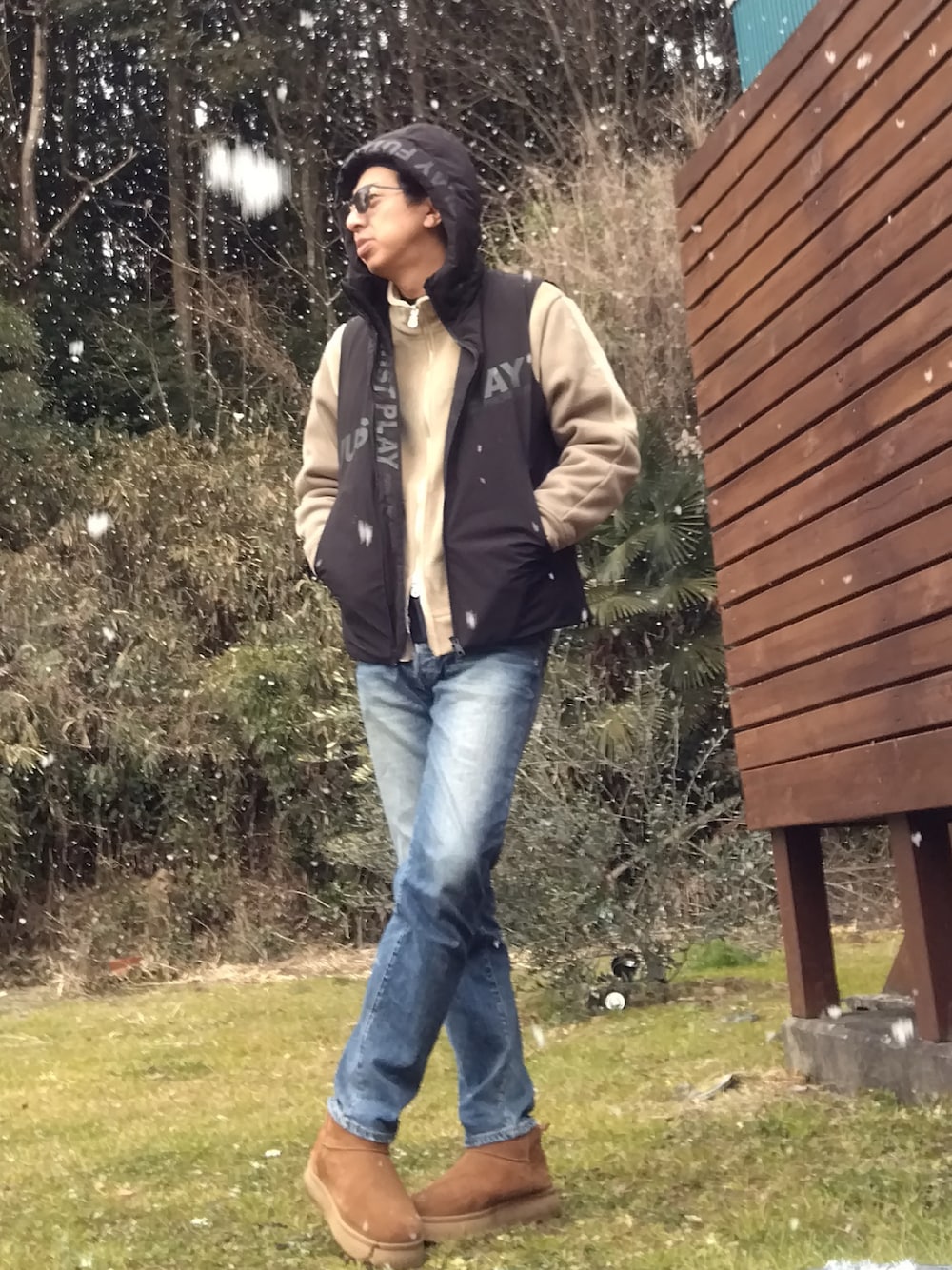 写真だとちょっと分かりにくいけど、 トップスは異素材を組み合わせたやつ。 見た目もいいし、ちゃんとあったかいのが嬉しい。 デニムはレッドカードトーキョー。 やっぱりいいものだけあって、色落ち感がほんと最高。 正直、自分にしか分からないレベルの自己満だけど、 こういうところが一番テンション上がる。