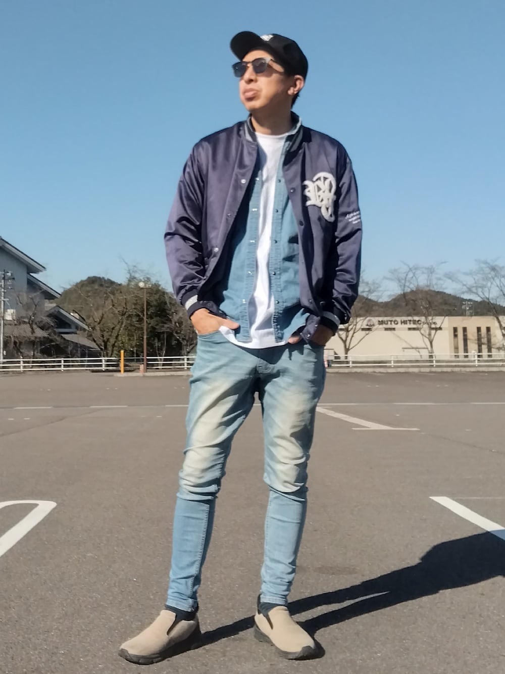 よく食べ寝て音楽聴き旅ほぼデニムのデニムパンツ「ハイパーストレッチサルエルスキニーデニム ジェギンス」を使ったコーディネート