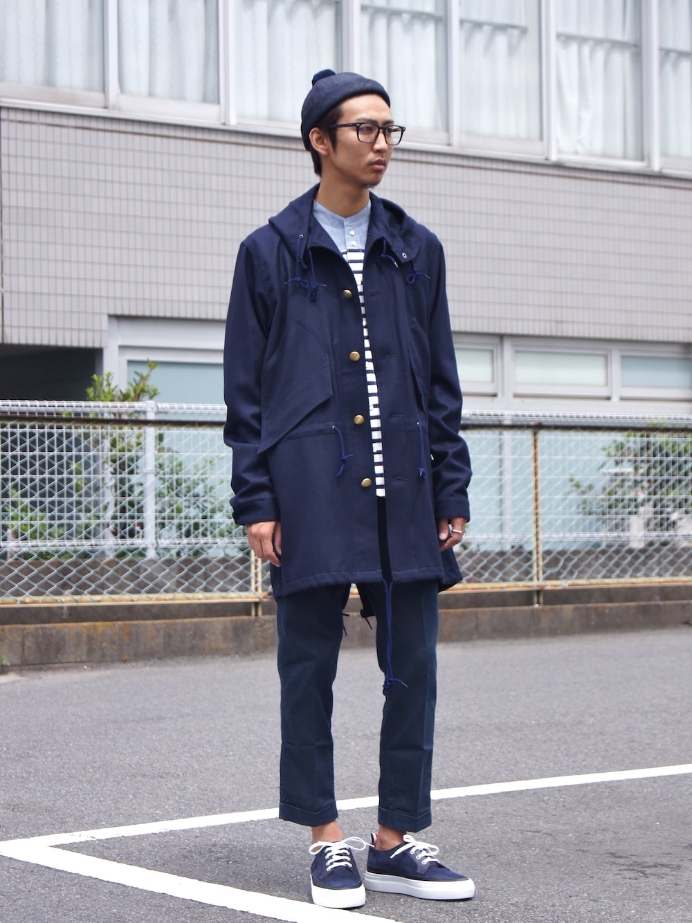 The FOURNESS コート M-51 COAT 51,840- シャツ BAND COLLAR WESTERN SHIRT - BORDER 30,240- visvim パンツ HIGH-WATER CHINO HERRINGBONE 30,240- THOM BROWNE. シューズ DOUBLE SOLE TRAINER W/ CUP SOLE 84,240- BETON CIRE キャップ MIKI - POMPON 15,660- THOM BROWNE. アイウェア TB-402-C 48,600-