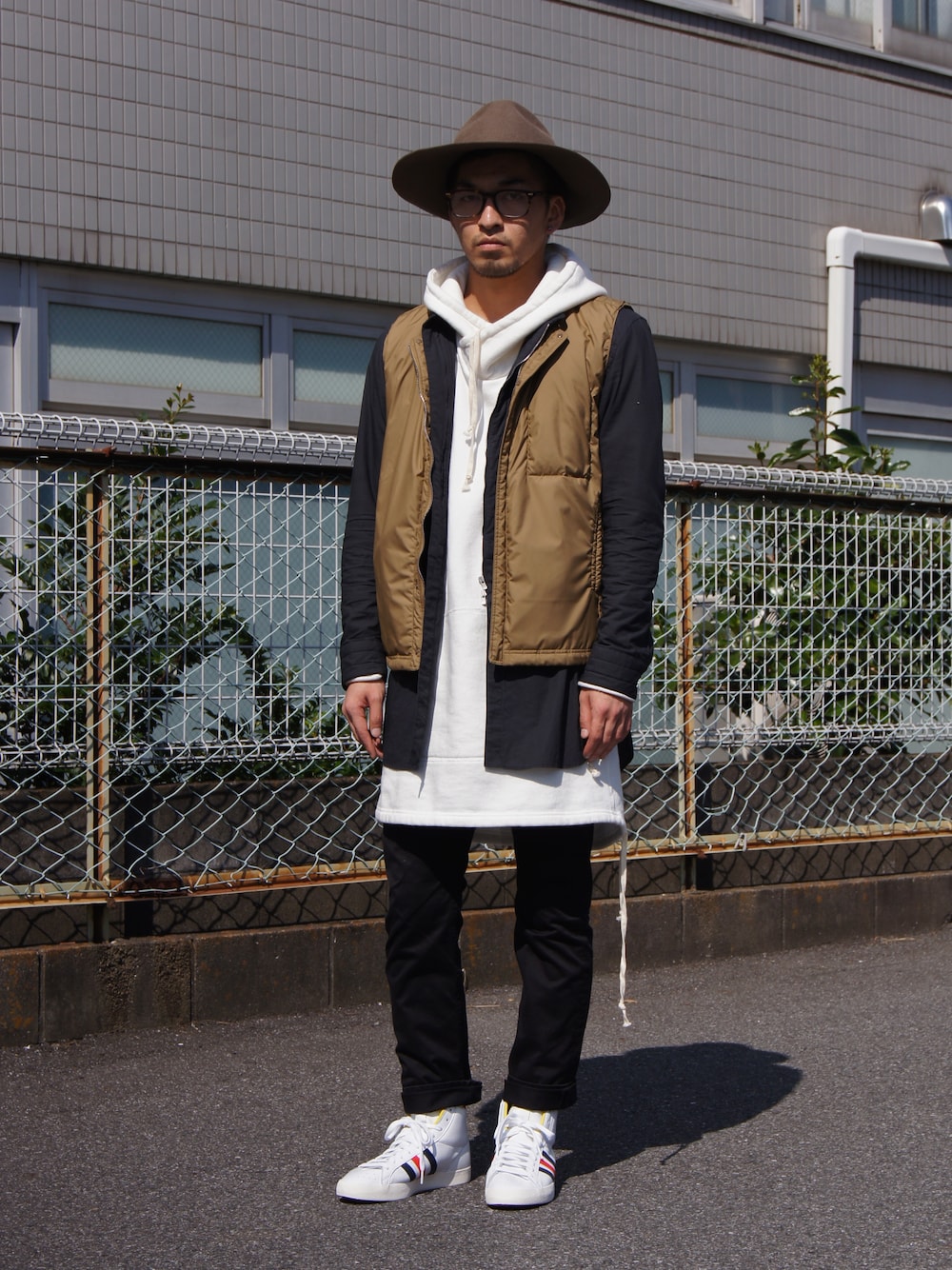 nonnative ハット LABORER HAT WIDE BRIM RABBIT FUR 21,600- ベスト DWELLER DOWN VEST POLY TAFETTA "REN" 41,040- シャツ STROLLER QUILTED LONG SHIRT COTTON MINI RIPSTOP OVERDYED 32,400- パーカー DWELLER HOODED PULLOVER LOOSE-FIT COTTON SWEAT OVERDYED 29,160- パンツ DWELLER 5P JEANS COTTON TWILL OVERDYED 23,760- THOM BROWNE. アイウェア TB-402-B 48,600- adidas originals シューズ BASKETPROFI FOURNESS 21,600-