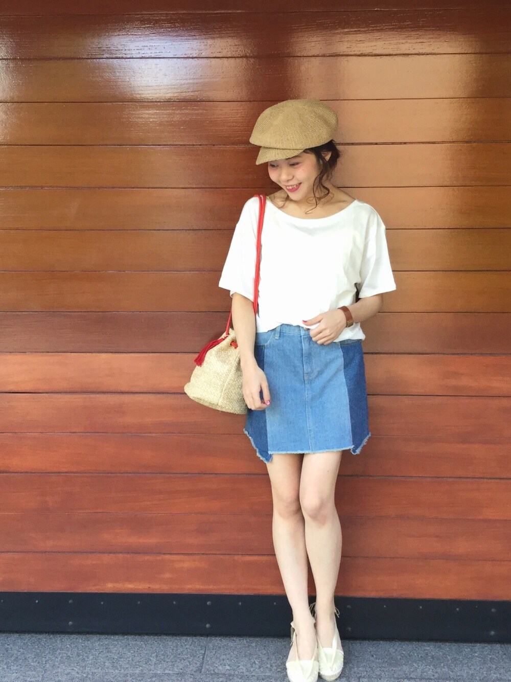 ホワイト×デニムでカジュアルコーデ🙂 夏らしい素材の小物と相性🙆
