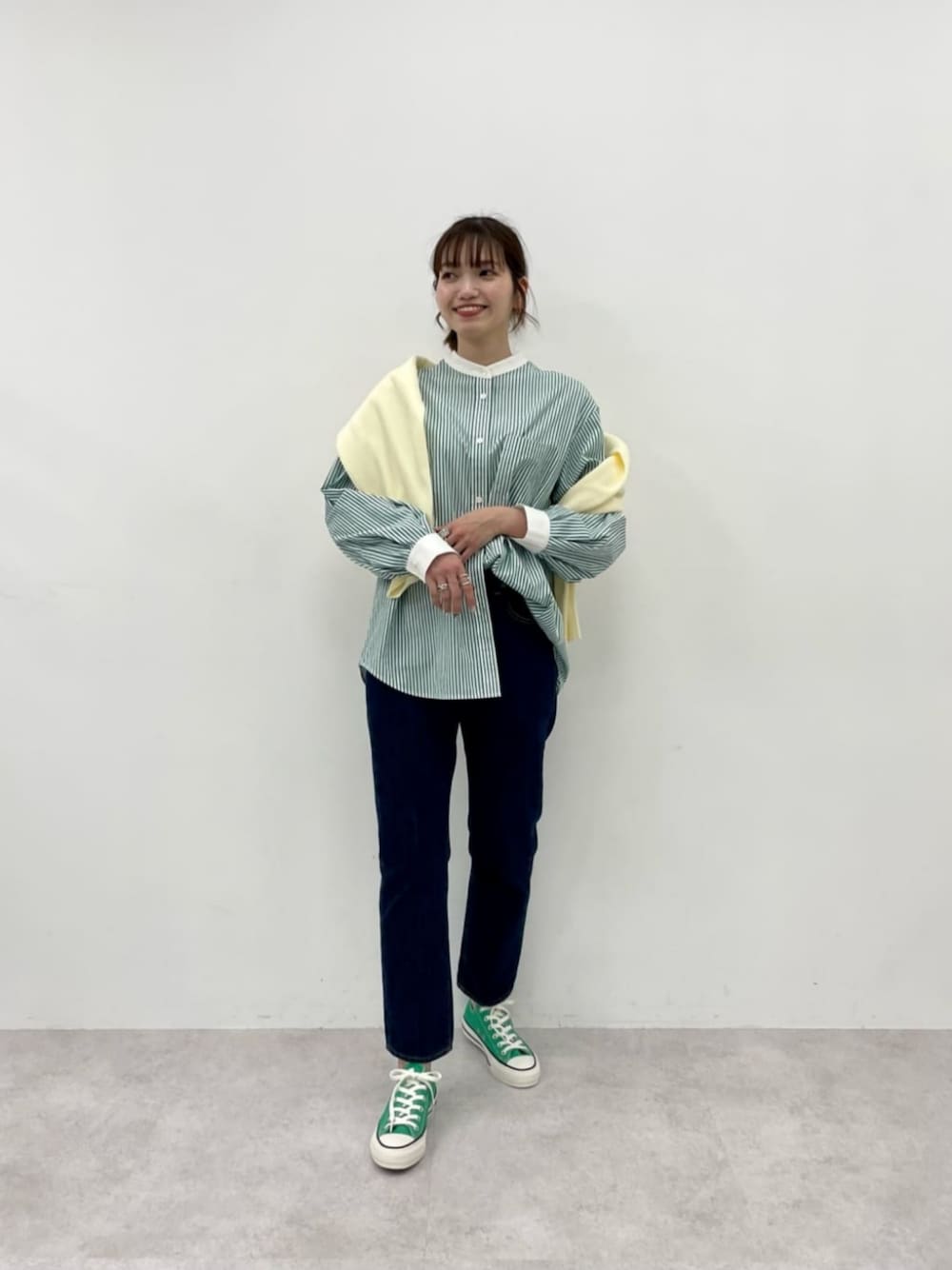 【身長165cm】 〈サイズ感〉 シャツ:ゆったり。165cmでお尻が隠れるくらいの着丈。 パンツ:標準的。くるぶしに少しかかるくらいの着丈。 〈スタイリングポイント〉 今季注目のグリーンカラーをメインにしたシンプルなスタイリング。 アイテムがシンプルなので、シャツを片方だけインした着こなしでメリハリをつけるのがおすすめです!