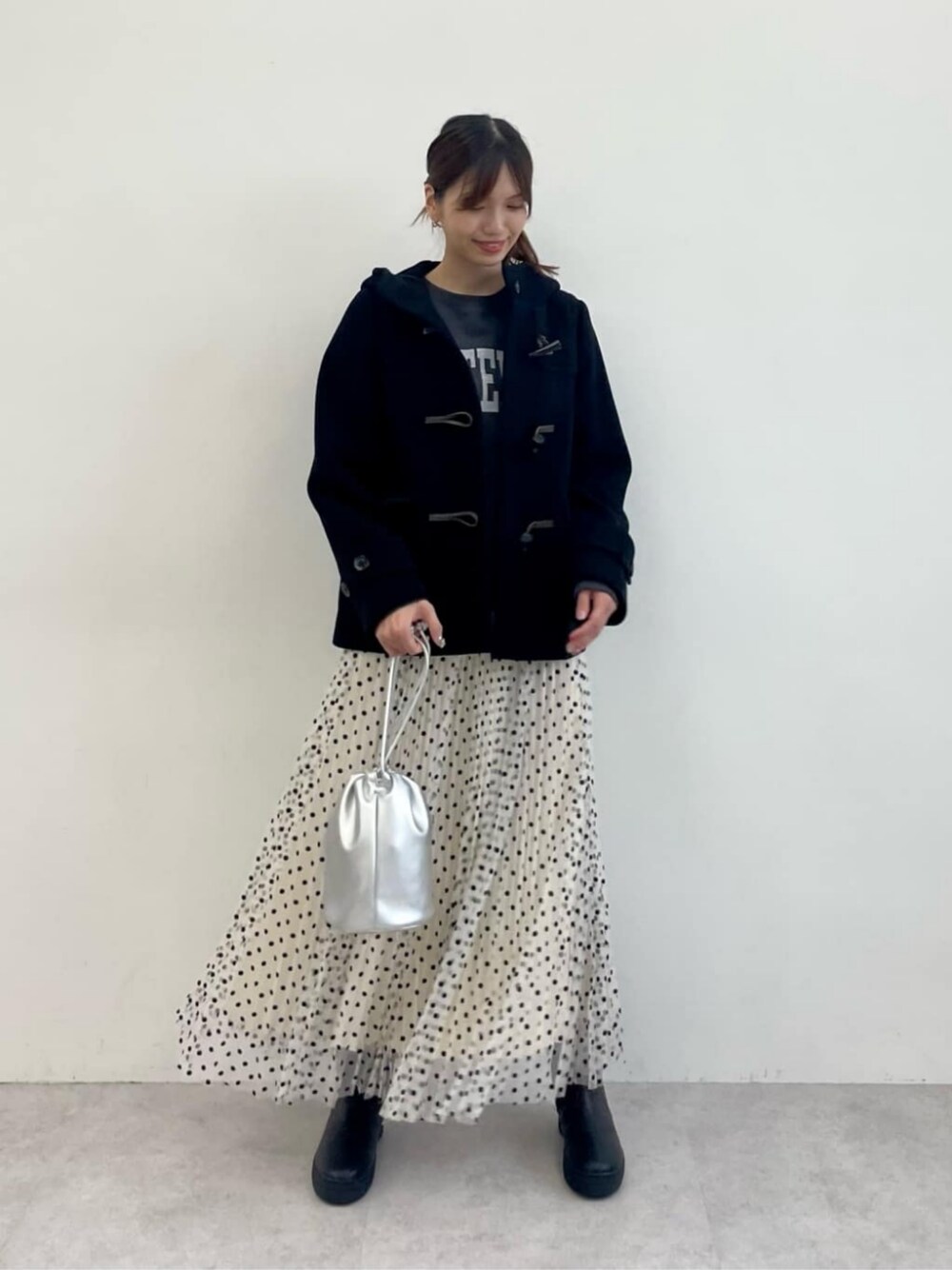 【身長165cm】 〈サイズ感〉 アウター: 標準的。165cm、38サイズ着用でヒップがほぼ隠れるくらいの着丈。厚手のニットやトレーナーだとワンサイズ上の方が着やすい。 トップス: ややゆったり。165cm、freeサイズ着用で後ろはヒップ隠れるくらいの着丈。 スカート: ウエストゴムでゆとりあり。165cm、freeサイズ着用で裏地は足首が見えるくらいの着丈。チュール部分はくるぶしが隠れるくらいの着丈。 シューズ: 標準的。普段24.5cm着用、足幅狭め、甲低めだとLサイズがちょうどいい履き心地。 〈スタイリングポイント〉 冬のフェミニンカジュアルスタイル。 トップスやアウターがダークトーンのカラーなので、スカートはホワイトを選んで抜け感をプラスしました。