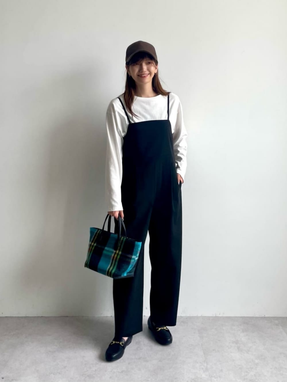 【身長165cm】 〈サイズ感〉 トップス: ゆったり。165cm、freeサイズ着用でヒップが半分隠れるくらいの着丈。 オールインワン: ややゆったり。着丈調節可能。165cm、freeサイズ着用で足首が見えるくらいの着丈。 シューズ: 標準的。普段24.5cm着用、足幅狭め、甲低めだと24cmがジャスト。タイツや靴下を合わせるなら24.5cmがちょうどいい履き心地。 〈スタイリングポイント〉 今時期のお出かけにオススメのコーデ。 モノトーンでまとめたスタイリングに、チェック柄のバッグやキャップで季節感をプラスしました。