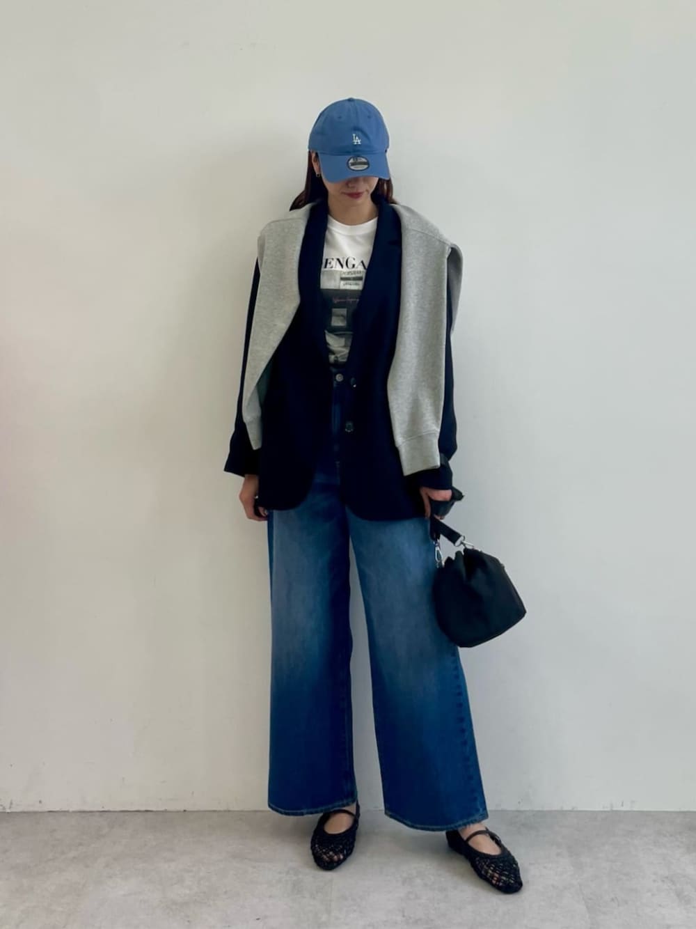 【身長165cm】 〈サイズ感〉 ジャケット: ゆったり。普段Mサイズ着用で、ブラウス、カットどちら着ても38サイズがちょうどいい着心地。中肉のスウェットカットも着用できるくらいのゆとり。 トップス: 標準的。165cm、freeサイズ着用でヒップが隠れるくらいの着丈。 ボトムス: 標準的。165cm、38サイズ着用でくるぶしにかかるくらいの着丈。 シューズ: 標準的。普段24.5cm着用、足幅狭め、甲低めだと24cmがジャスト。 〈スタイリングポイント〉 ジャケットをカジュアルダウンしたトレンド感溢れる春コーデ。 スウェットなどカジュアルなアイテムが多いので、シューズは女性らしいパンプスを合わせてキレイさをプラスすると◎ デニムやキャップのブルーをポイントに春らしい印象にしました。
