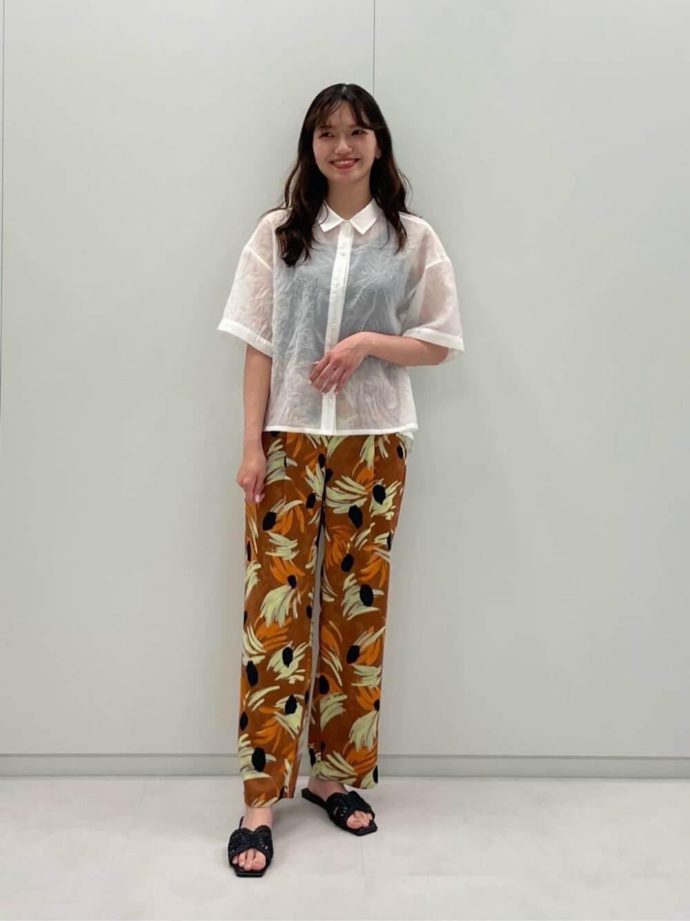 【身長165cm】 〈サイズ感〉 トップス: ややゆったり。165cm、freeサイズ着用でヒップ隠れるくらいの着丈。 ボトムス: ウエストゴムでややゆとりあり。ウエスト調節可能。165cm、freeサイズ着用でくるぶしにかかるくらいの着丈。 シューズ: 標準的。普段24.5cm着用、足幅狭め、甲低めだとLサイズがちょうどいい履き心地。 〈スタイリングポイント〉 夏のお出かけにオススメなカジュアルスタイリング。 パンツの柄が印象的なので、シャツは襟付きを選んできちんと感をプラスして大人カジュアルにまとめました。