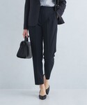 【身長165cm】 〈サイズ感〉 ジャケット: 標準的。普段Mサイズ着用で、ブラウス、カットどちら着ても38サイズがジャスト。袖ボリュームのブラウスだと着用しづらい。 トップス: 標準的。165cm、freeサイズ着用で腰骨にかかるくらいの着丈。 ボトムス: ウエスト後ろゴムでややゆとりあり。165cm、38サイズ着用でくるぶしが見えるくらいの着丈。 シューズ: 標準的。普段24.5cm着用、足幅狭め、甲低めだと24cmがジャスト。 〈スタイリングポイント〉 ネイビーのセットアップコーデ。 インナーに合わせて、シューズやバッグも明るめカラーを選び軽さをプラスしました。 レースの襟やポインテッドパンプスで女性らしい華やかさを加えれば、セレモニーシーンでも着用いただけます。